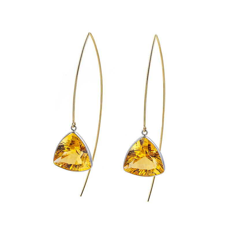 【2025年3月ガイド誌掲載】大粒シトリンにトリリアンカットを施し、モダンなピアスにお仕立てしました。鮮やかな黄色がお顔周りを華やかに引き立てます。